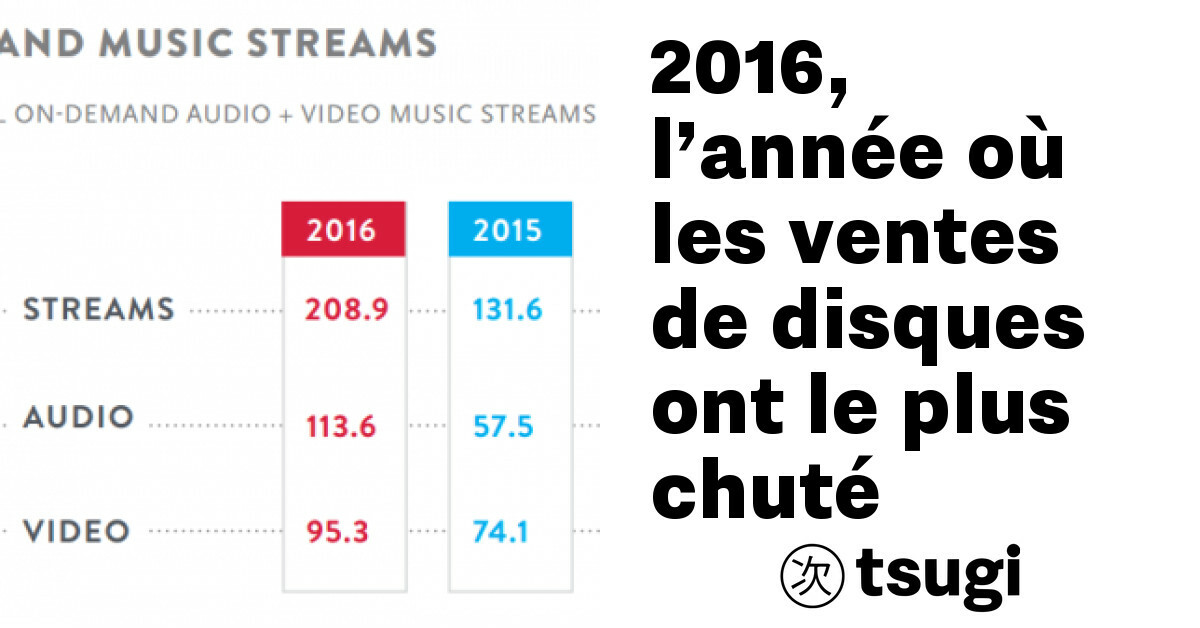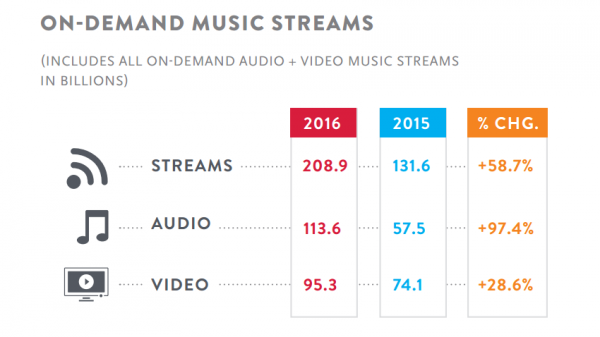 De bonnes nouvelles à tirer de ce rapport : les vinyles continuent de s’en sortir avec une augmentation de 11,4%. L’album Blackstar de Bowie est le plus vendu dans ce format. Mais c’est surtout le streaming qui sort gagnant de ces derniers six mois. Entre le 1er janvier et le 30 juin 2016, le monde a écouté 208,9 milliards de titres en streaming, contre 131,6 milliards en 2015, soit une hausse de 58,7%.