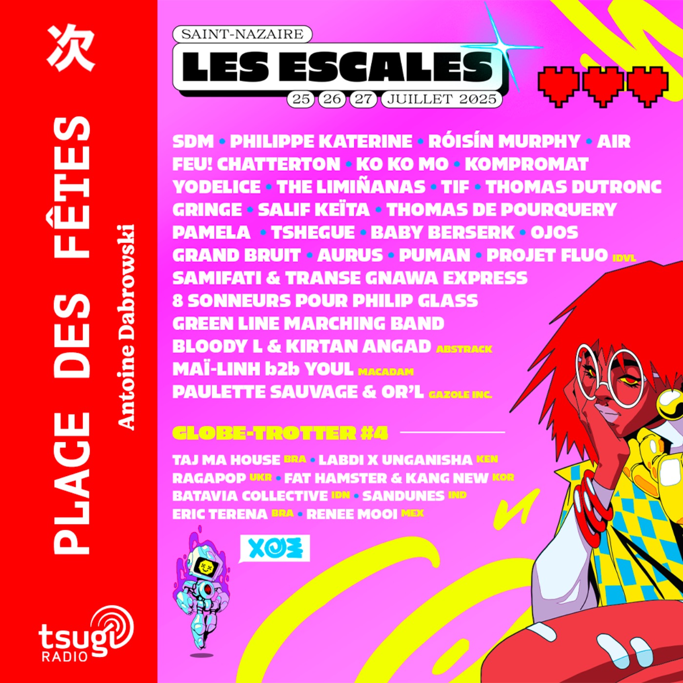 Que serait l’été de Tsugi Radio sans notre visite annuelle sur le port industriel de Saint-Nazaire, entre le chantier naval, les éoliennes offshore, le pont, l’estuaire de la Loire ?… Un site magiquement scénographié par les équipes du Festival Les Escales. Philippe Katerine, Roisin Murphy, Air, Feu! Chatterton, Ko Ko Mo, Kompromat, Pamela, Tshegue, Aurus, ça c’est pour les noms un peu plus identifiés qu’on pourra voir les 25, 26 et 27 juillet. Mais depuis 4 ans avec son initiative, Globe Trotter, les escales de Saint-Nazaire tissent des liens avec des festivals un peu partout dans le monde car quand on se tient sur l’île du Petit Maroc, là où la Loire se jette dans l’Atlantique, on se doit d’ouvrir grand les yeux et les oreilles sur les artistes du monde entier. Aujourd’hui sur Tsugi Radio, focus sur les Escales de Saint-Nazaire 2025. avec Jérôme Gaboriau, programmateur du festival.