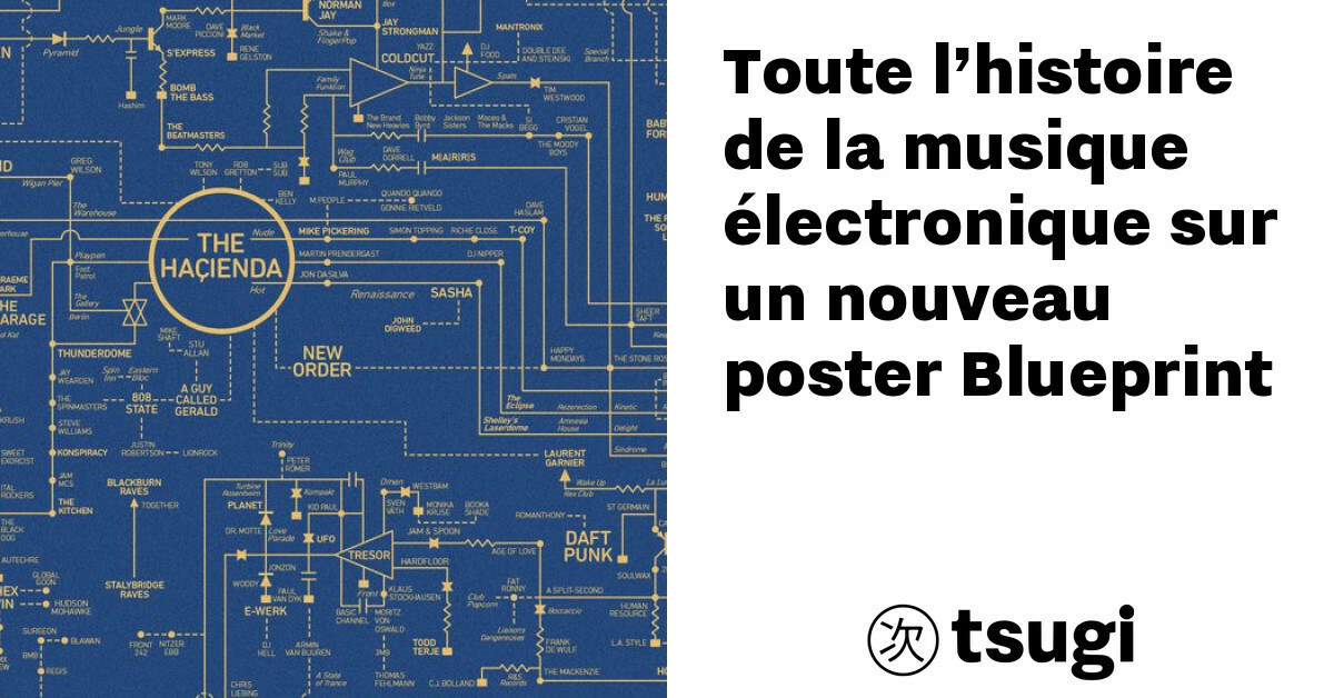 Acid House Love Blueprint: A History Of Dance Music And Rave Culture s’étale sur 60x80cm et célèbre à la fois artistes, groupes, clubs, labels, machines, stations de radio et fanzines ayant eu un impact majeur sur la culture électronique. Parmi les noms à la plus grosse police, on retrouve les pionniers du genre comme The Haçienda, l’ancien club de Manchester fermé en 1997 et le New-Yorkais Paradise Garage démoli depuis, Ministry Of Sound basé dans le sud de Londres et le mythique club berlinois Berghain mais aussi The Orb, New Order et les Belleville Three (Juan Atkins, Derrick May et Kevin Saunderson) considérés comme les créateurs de la techno de Detroit.